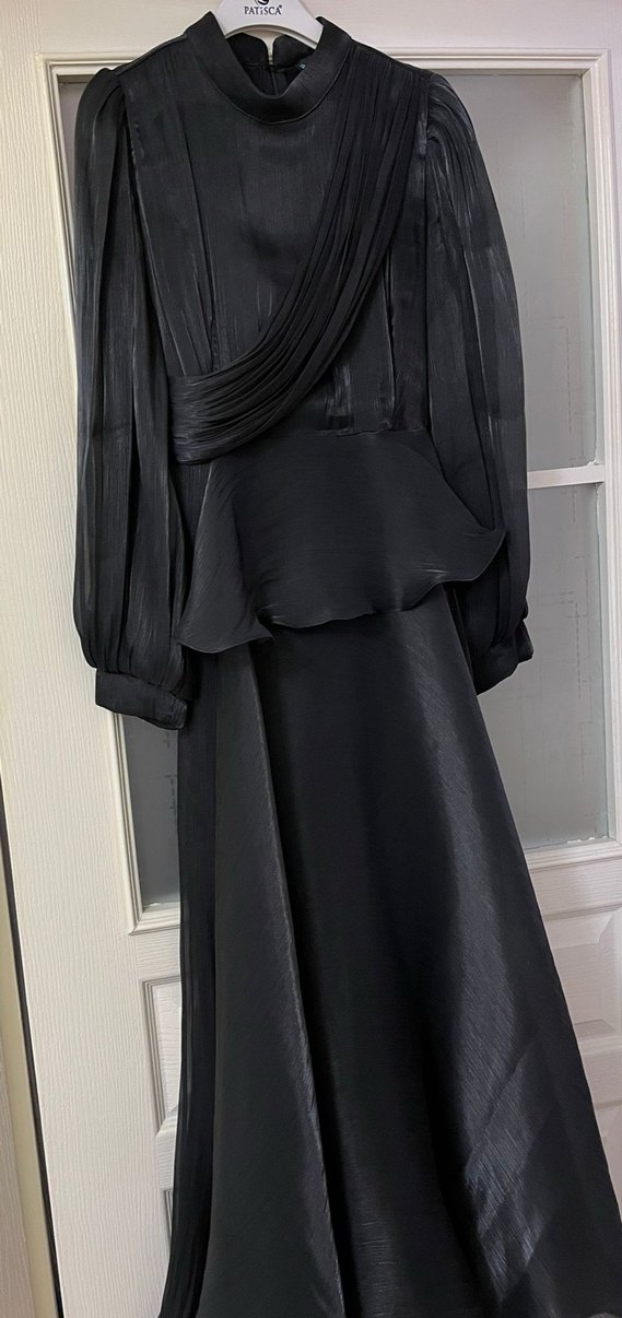 Siyah, drapeli tasarıma sahip uzun elbise, satenimsi kumaş, yüksek yakalı ve uzun kolludur. Düzenli kesim ve gotik klasik şıklığı yansıtır.