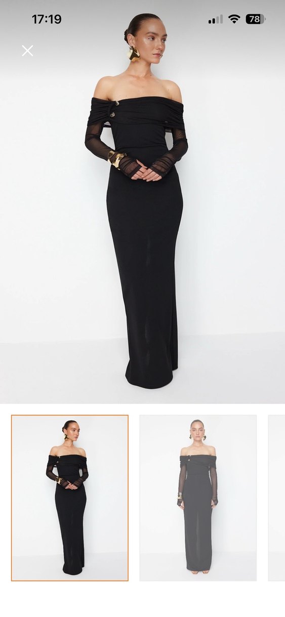 Siyah, drapeli uzun ve vücuda oturan elbise, tekne yaka ve ince askılı kollara sahiptir. Ipeksi kumaştan, minimalist gotik tarzda ofis kullanımı için uygundur.