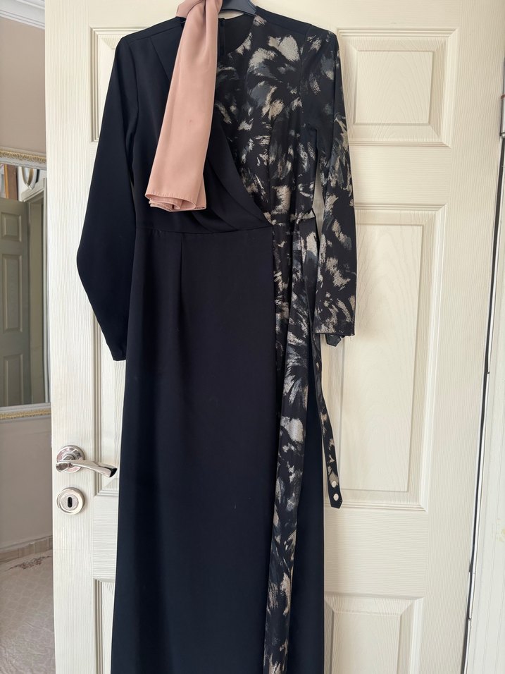 Uzun siyah elbise, bir tarafında bağlama desenli drapeli tasarıma ve kesik yaka detayına sahiptir. Düzenli kesim, ipeksi kumaş ve askılı kollarla ofis için uygundur. Şalı ile birlikte