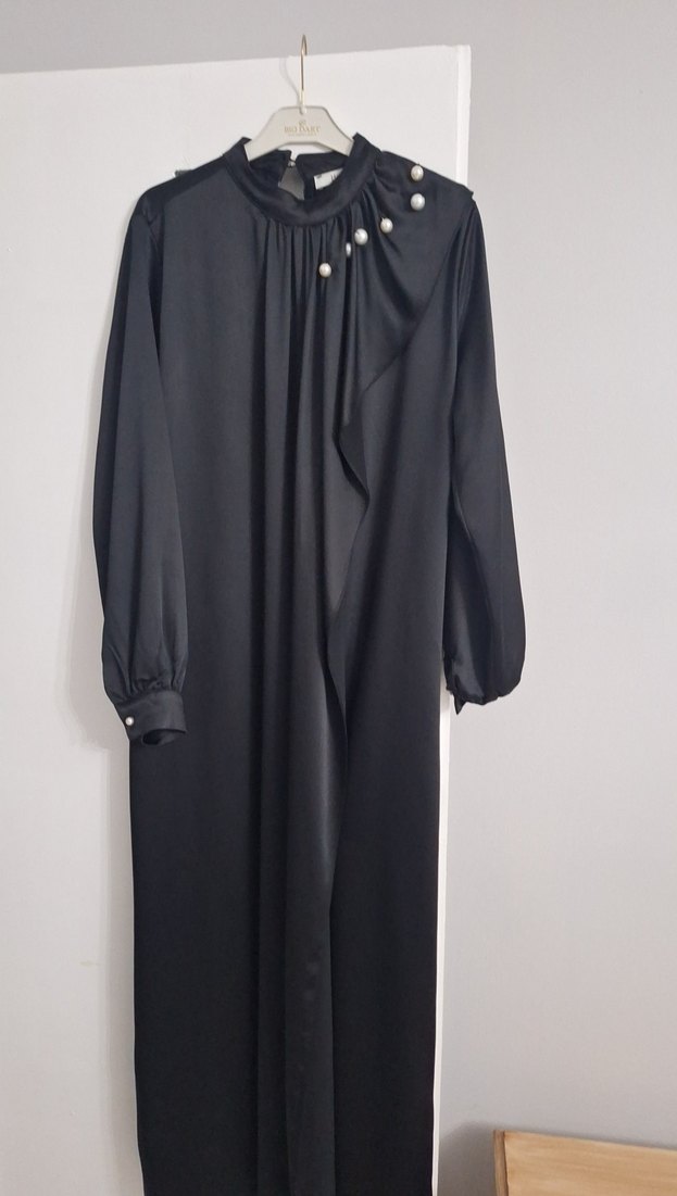 biy 140 cm iki kol genisli58 cm Siyah, uzun, yüksek yakalı ve uzun kollu bu kadın elbisesi, ipeksi kumaştan yapılmış ve drapeli tasarıma inci düğmelerle detaylandırılmıştır. Ofis için şık bir seçim.