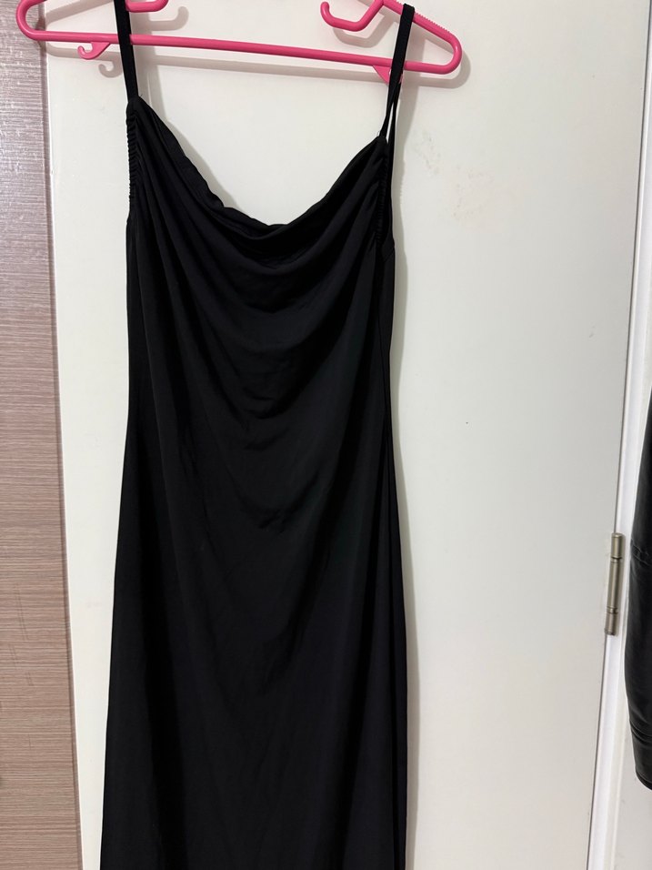 Siyah, askılı, uzun ve drapeli tek parça, satenimsi kumaştan, romantik akşamlar için uygun.