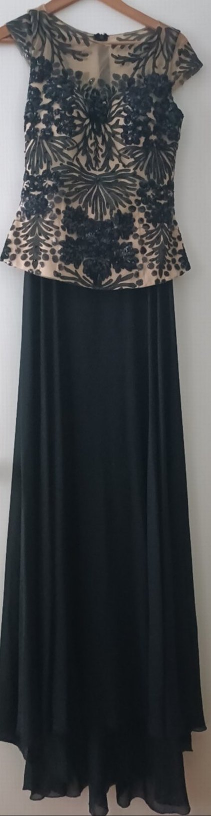 Satenimsi kumaştan, drapeli, kayık yaka ve kolsuz siyah uzun elbise. Gevşek kesimi ve desenli gotik tarzıyla ofis için uygun.