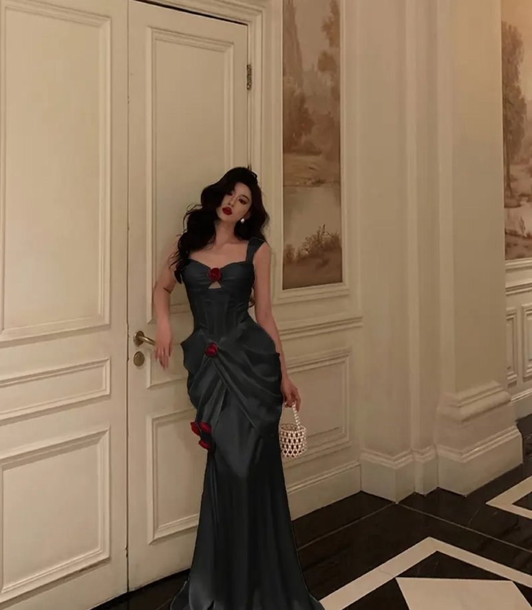 Siyah, drapeli ve nakış detaylı, straplez ve ince askılı uzun elbise. Bu ilanı satın alabilirsiniz ☺️