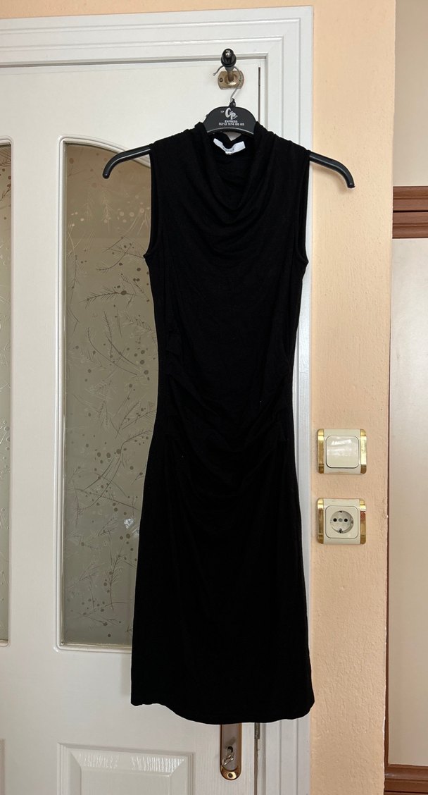 Drapeli detaylı, yüksek yakalı, kolsuz ve vücuda oturan siyah uzun elbise. Pürüzsüz sentetik kumaştan, gotik tarzda romantik akşamlar için uygun.