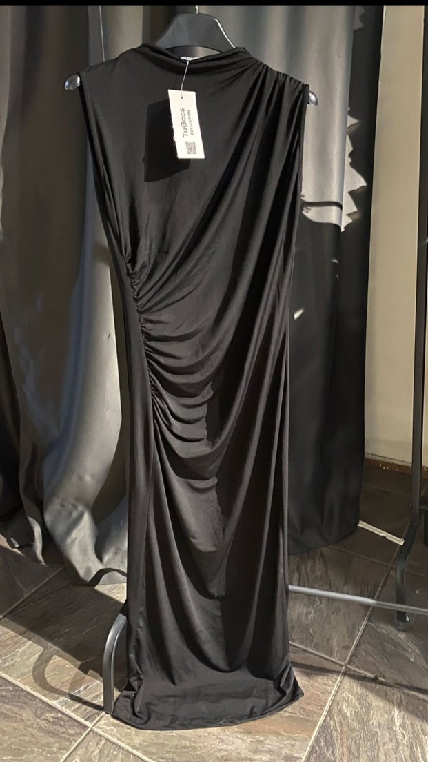Siyah, kolsuz, uzun ve vücuda oturan bir elbise, drapeli Maxi boy hiç kullanılmadı sıfır marka temsilidir