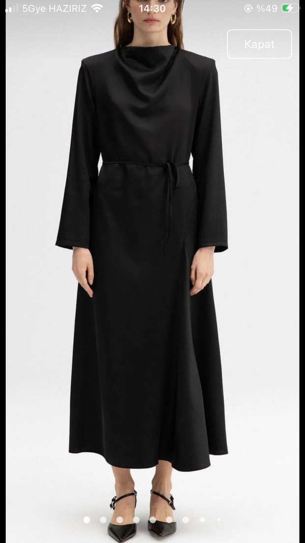 MANUKA Siyah, uzun kollu, yüksek yakalı ve drapeli tasarıma sahip, ipeksi dokulu uzun elbise. Ofis kullanımı için uygun, kemer detaylı ve regular fit.