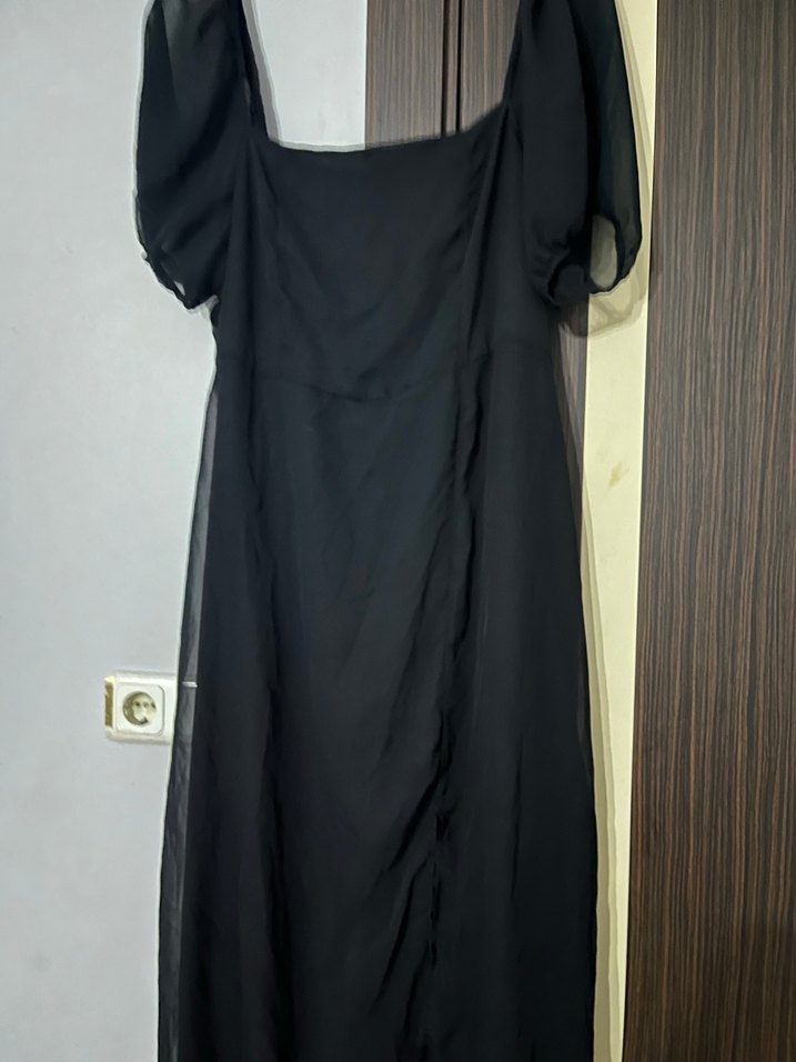 Siyah uzun elbise, drapeli tasarımı, kayık yaka ve kısa kollu. İpek gibi kumaştan, bol kesimle gotik ofis stiline uygun.