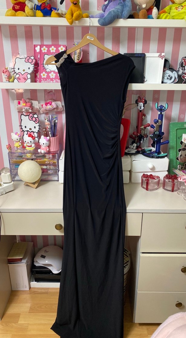 Siyah, drapeli ve v yakalı, uzun ve kolsuz, klasik şıklıkta kadın elbisesi. İpeksi dokusu ile romantik geceler için uygundur.