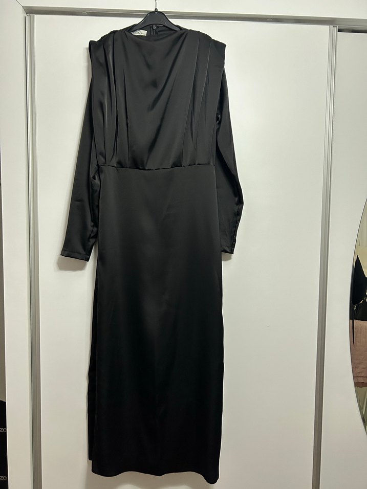 Siyah renkte, yüksek yakalı ve uzun kollu, drapeli tasarıma sahip uzun elbise. İpek gibi dokusu saten abiye elbise seyyar kemer