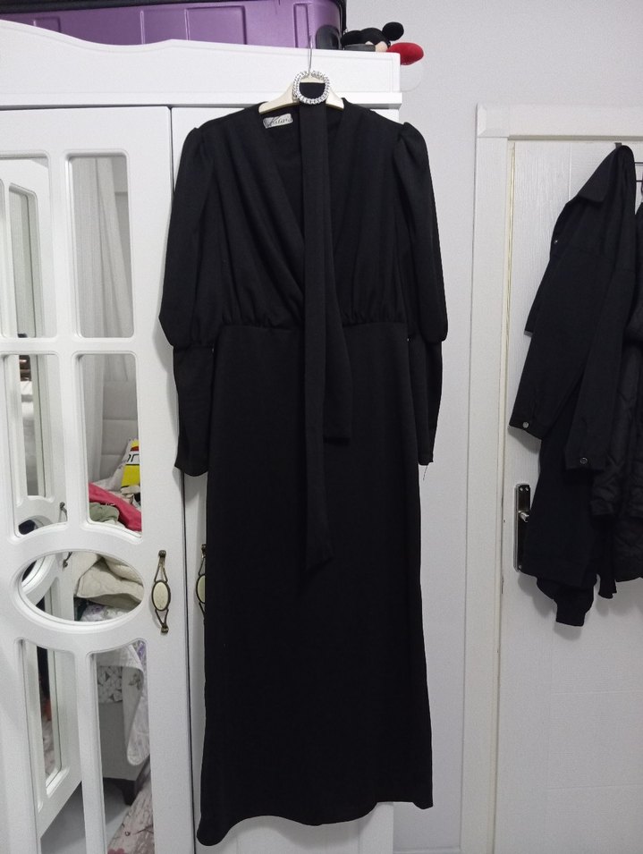 Siyah uzun elbise, drapeli tasarımı, yakalı ve uzun kolludur. Rahat kesim ve ipeksi dokusu ile ofise uygun, mütevazı Paris tarzı goth görünüm sağlar. sadece birkaç kez giydim temizdir
