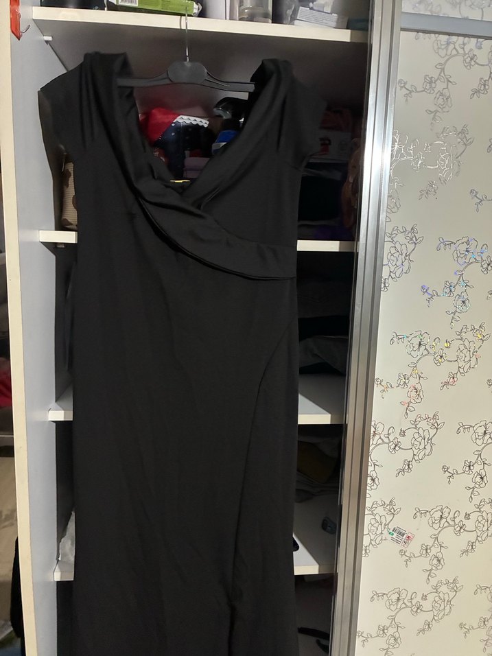 Bu siyah uzun elbise, drapeli V yakası ve kolsuz tasarımıyla, ipeksi kumaştan yapılmıştır ve minimalist goth tarzını yansıtır.