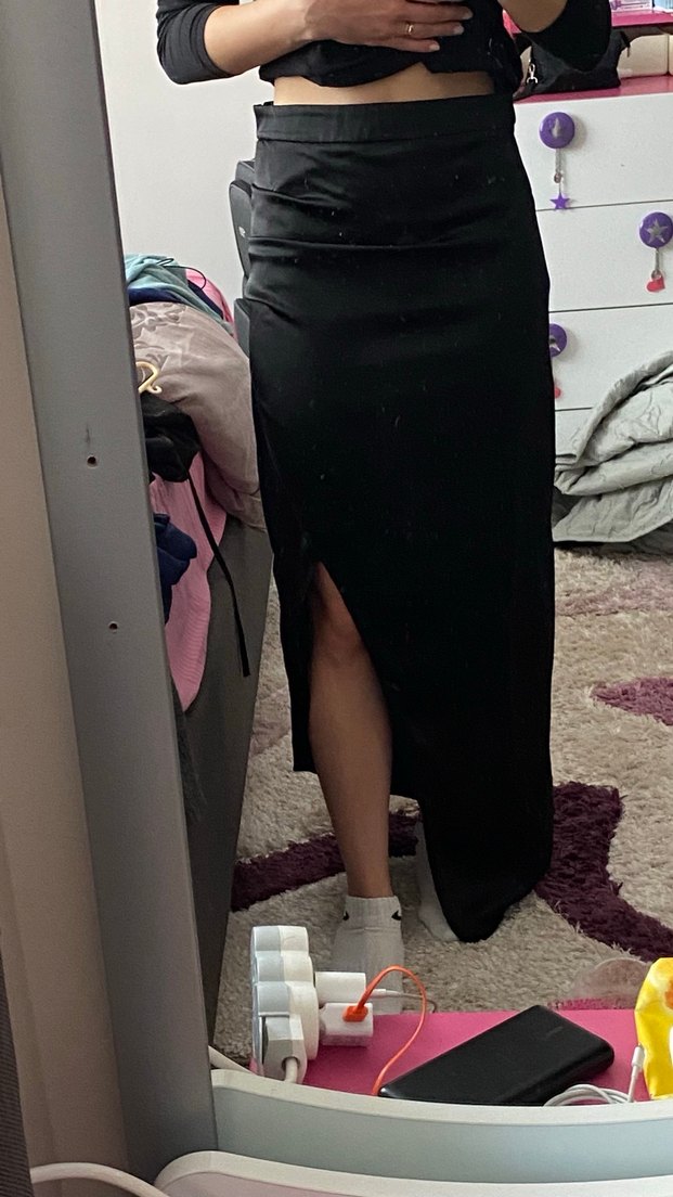 Drapeli ve yırtmaçlı, ince saten kumaş S beden ama ben giydiğimde M bedendim tam olmuştu bol kesim biraz. Göbeği saklıyor. Yırtmacı çok açıktı ben diktirdim istenirse açılabilecek bir dikişi var. Boyum 1.60.