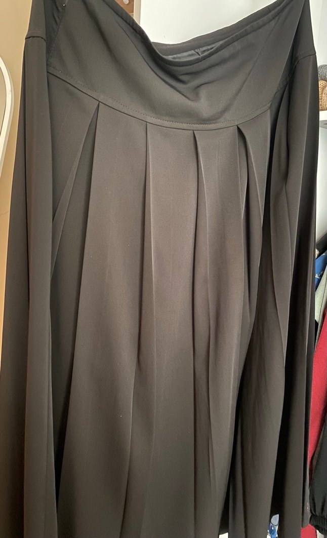 Siyah renkte, drapeli ve bol kesim uzun kadın eteği. Pürüzsüz sentetik kumaştan, minimalist gotik tarzda ofis için uygundur. Ekranda gri gibi duruyor ama siyah rengi.Solma vs. yok
