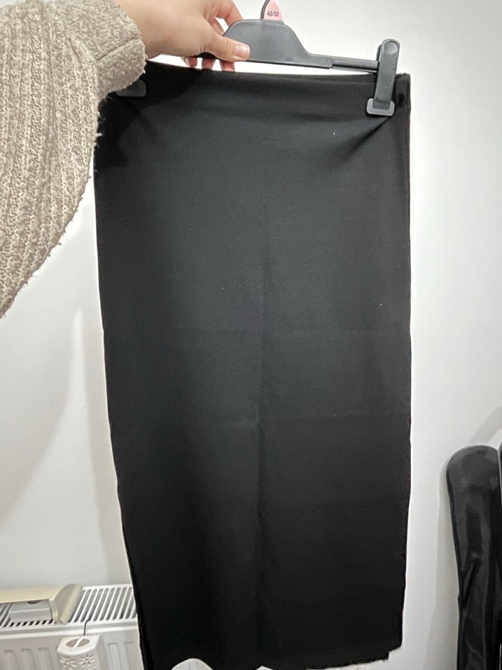 Drapeli detaylı, siyah, uzun ve vücuda oturan kadın eteği, minimalist sokak stiline uygun, ofis için ideal. 2 tarafından da böyle yırtmaçlı diz kapağına kadar yırtmacı.