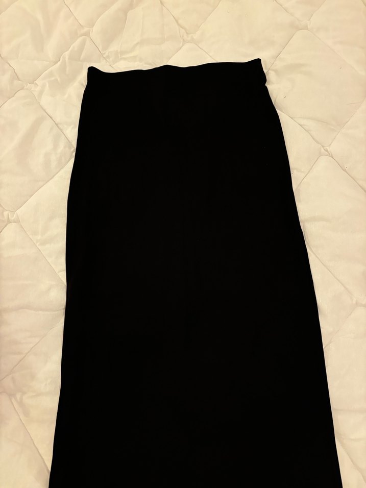Siyah renkli, drapeli tasarıma sahip, yumuşak ve sıcak kumaştan yapılmış, uzun ve vücuda oturan kadın eteği. Minimalist ve ofis stiline uygun.