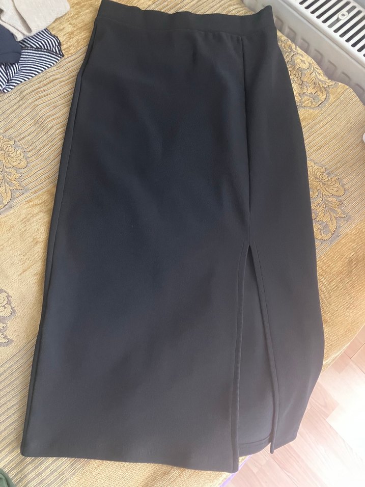 Siyah, sentetik kumaştan yapılmış, drapeli ve fitted kesim uzun kadın eteği. Ofis ve street wear için uygun, şık bir parça.