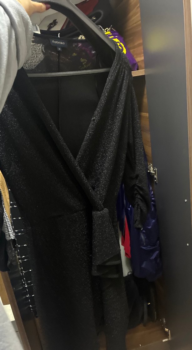 Drapeli tasarıma sahip, kesimi vücuda oturan siyah uzun kaban, yakası kesik ve uzun kolludur. Pürüzsüz sentetik kumaştan üretilmiştir.