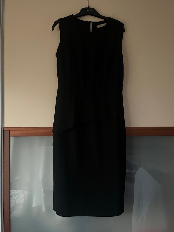 Siyah, kolsuz uzun elbise, drapeli tasarıma ve V yakaya sahip. Ofis ortamına uygun klasik şıklıkta, regular fit kesim.