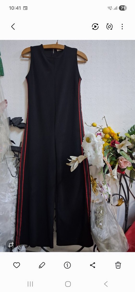 Siyah, kolsuz, yüksek yakalı, kırmızı yan çizgili ve drapeli tasarıma sahip uzun kadın tulumu. Sentetik kumaştan, rahat kesimle.