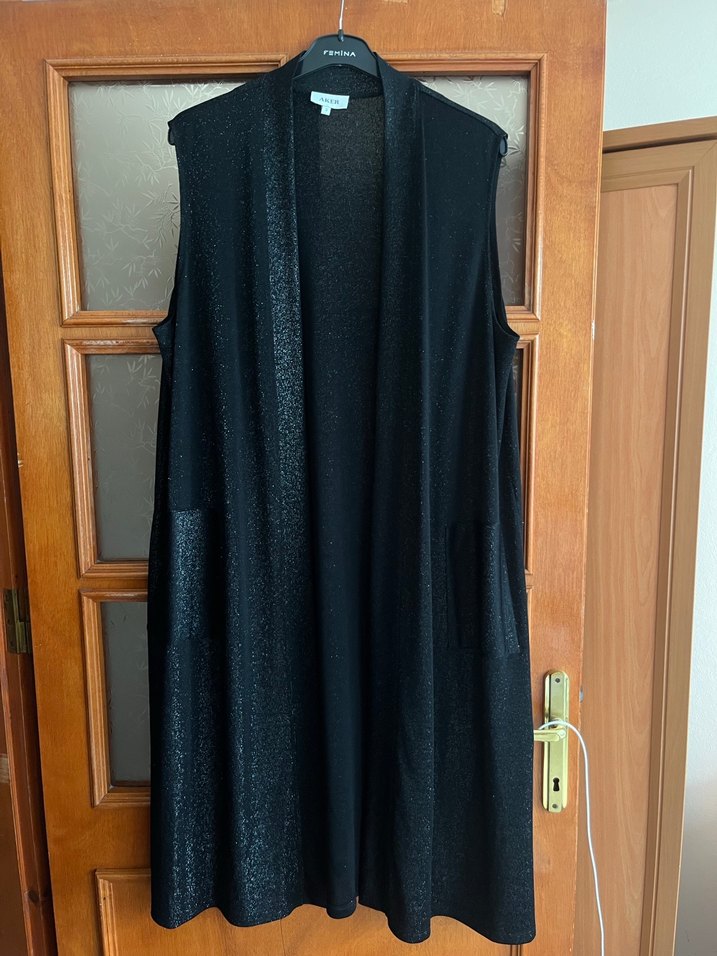 Siyah, kolsuz, drapeli uzun kadın yelek. Notch yaka ve sentetik kumaştan, ofis için uygun, regular fit.