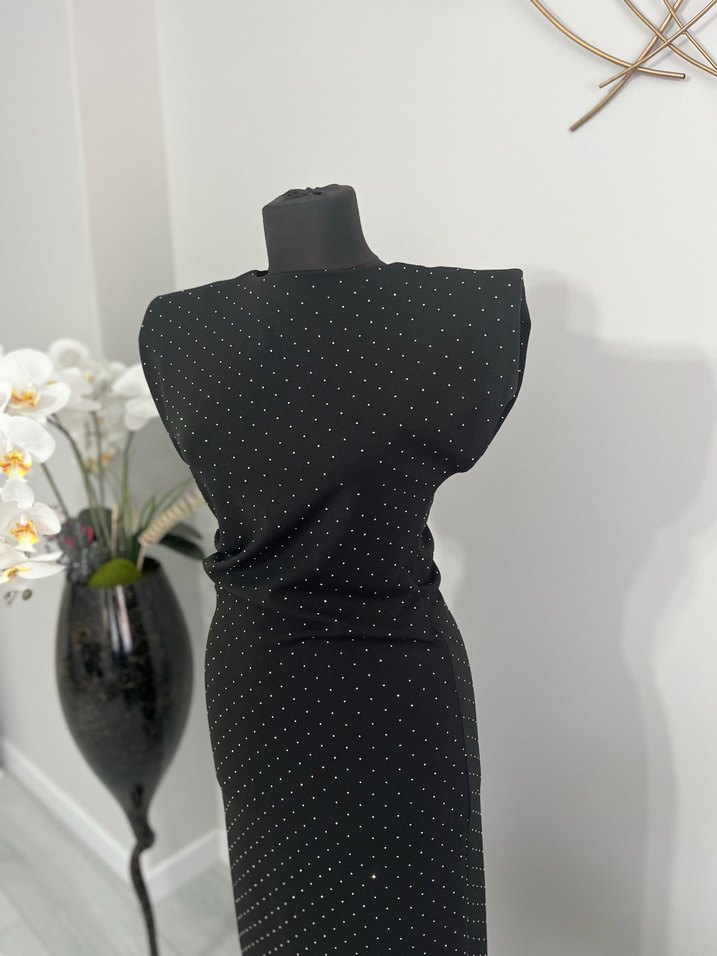 Yüksek yakalı, drapeli ve regular fit kesimli siyah uzun kalem elbise. Kolsuz ve puantiyeli desene sahip, sokak modasına uygun bir tasarım. ✨