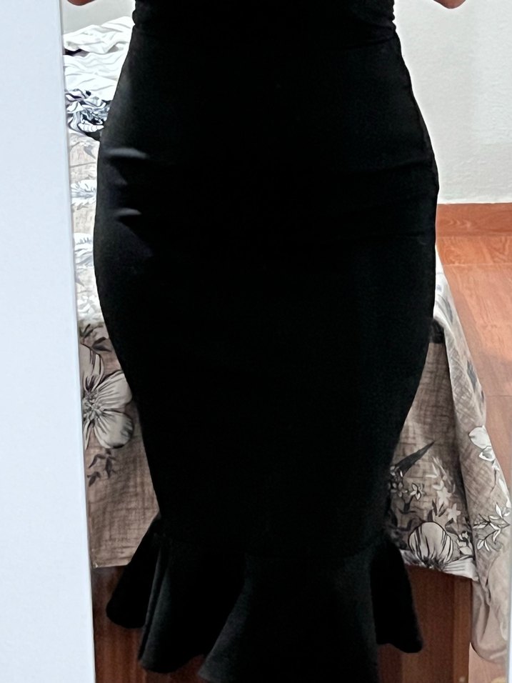 Siyah uzun kalem etek, drapeli detaylara sahip ve sentetik kumaştan üretilmiştir. Romantik gece için goth tarzı bir seçenek.