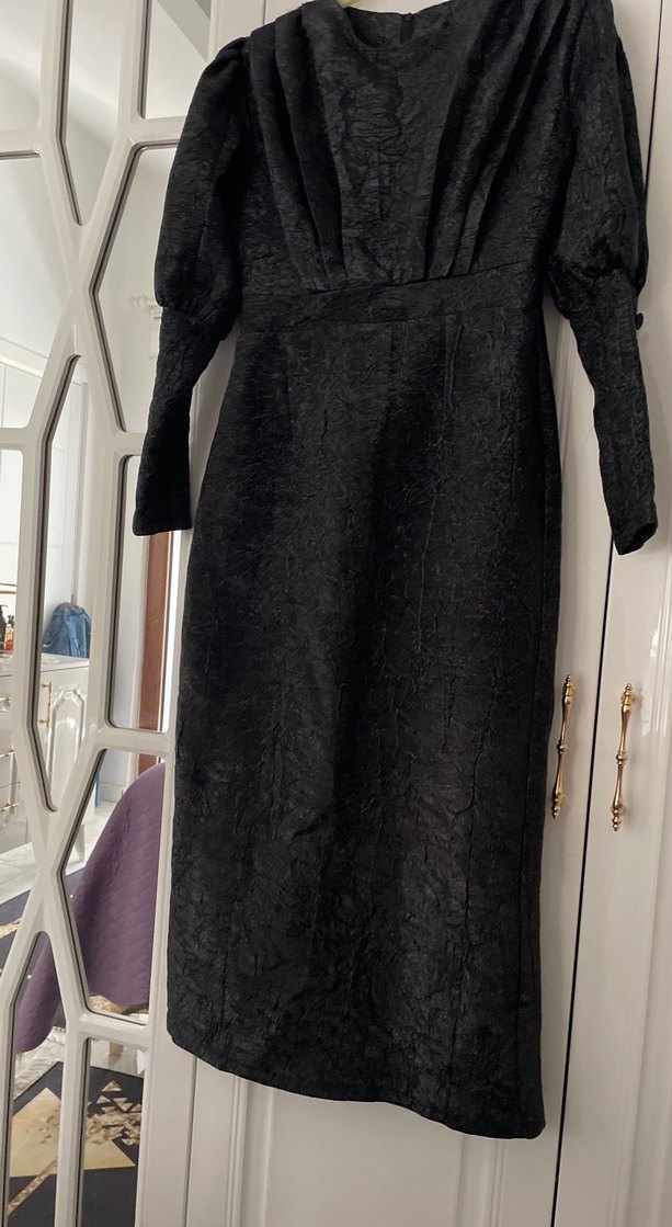 Siyah, keten kumaştan, drapeli detaylara sahip, uzun kollu ve yakası kesik uzun elbise. Ofis için uygun gotik tarzda, vücuda oturan kesim.