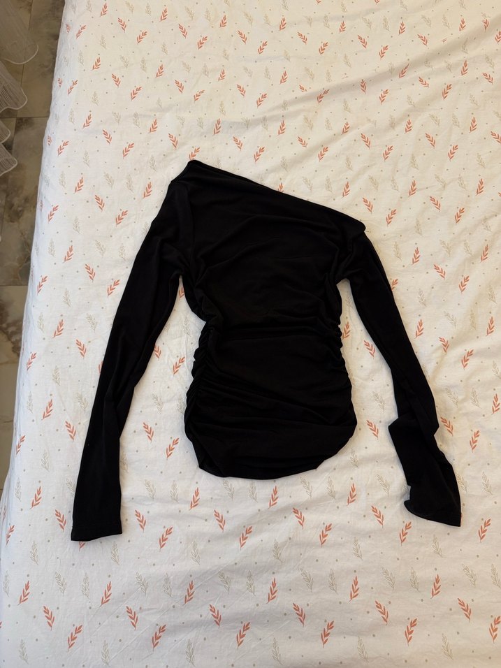 Siyah, uzun kollu, tek renk drapeli ve tekne yaka, vücuda oturan rahat kesim bluz.Boutiqen asimetrik yaka üst