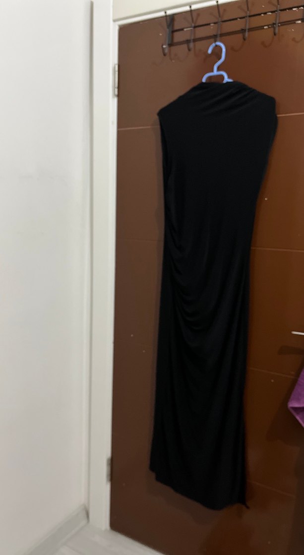 Siyah, drapeli ve kolsuz uzun elbise, yüksek yakalı ve ince kesimli. Ofis için şık ve minimalist tarzda, ipeksi dokuda.