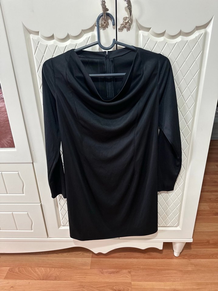 Siyah renkte, drapeli yüksek yakalı ve uzun kollu, vücuda oturan kesime sahip, ipeksi dokulu minimalist ve çağdaş tarzda kadın elbise.
