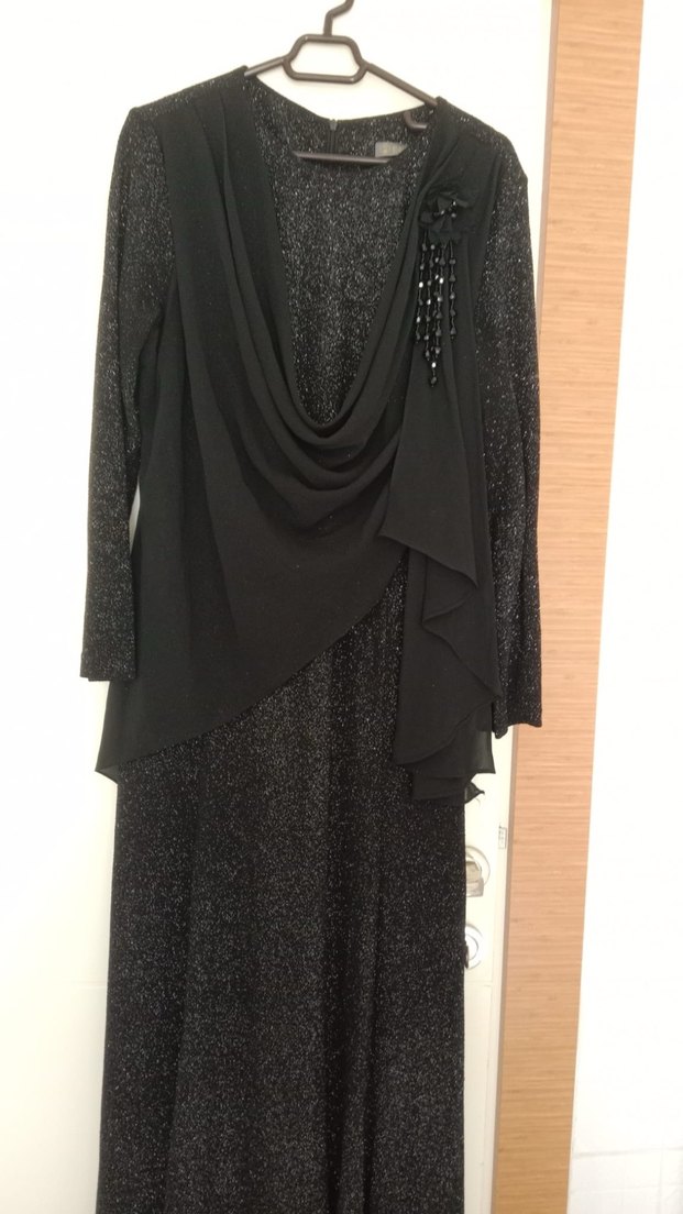 Drapeli ve V yakalı uzun kollu siyah gece elbisesi. Gevşek kesimli ve hafif parlak dokusu ile avant-garde parti stiline uygun,bir kere giyildi temizdir.