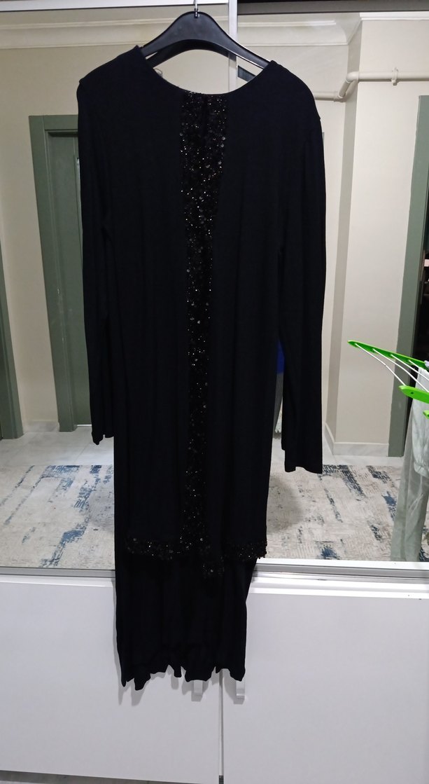 Siyah renkte, uzun kollu ve drapeli kesime sahip bu elbise, satenimsi kumaşı ve yaka detayıyla gotik tarzda klasik bir şıklık sunar.