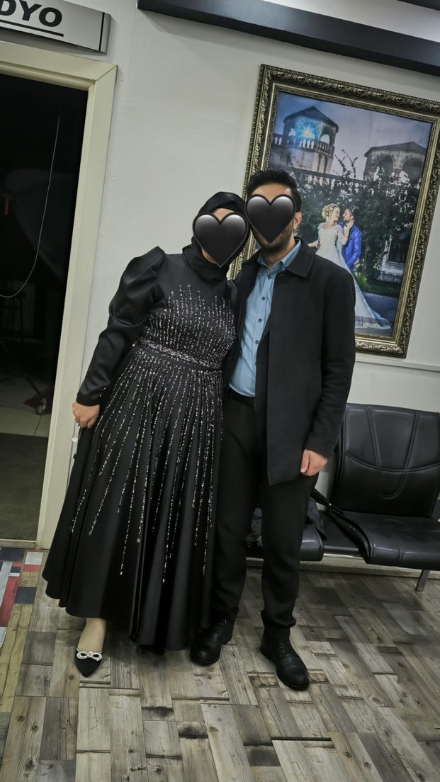 Drapeli detaylara ve kesikli yaka tasarımına sahip siyah uzun kollu, desenli ve regular fit nişan elbisesi. Gotik düğünler için uygun. 44/46 BEDEN UYUMLU