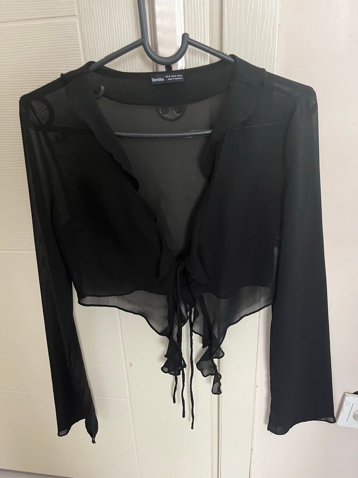 Siyah, uzun kollu, halter yaka ve drapeli tasarıma sahip ince dokulu bluz. Gotik tarzı yansıtan şık kesim.