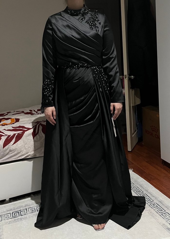 Siyah, drapeli ve uzun kollu, yüksek yakalı bu dar kesim abiye elbise, gotik klasik şıklığı yansıtıyor. Desenli ve uzun boylu, düğünler için uygun.