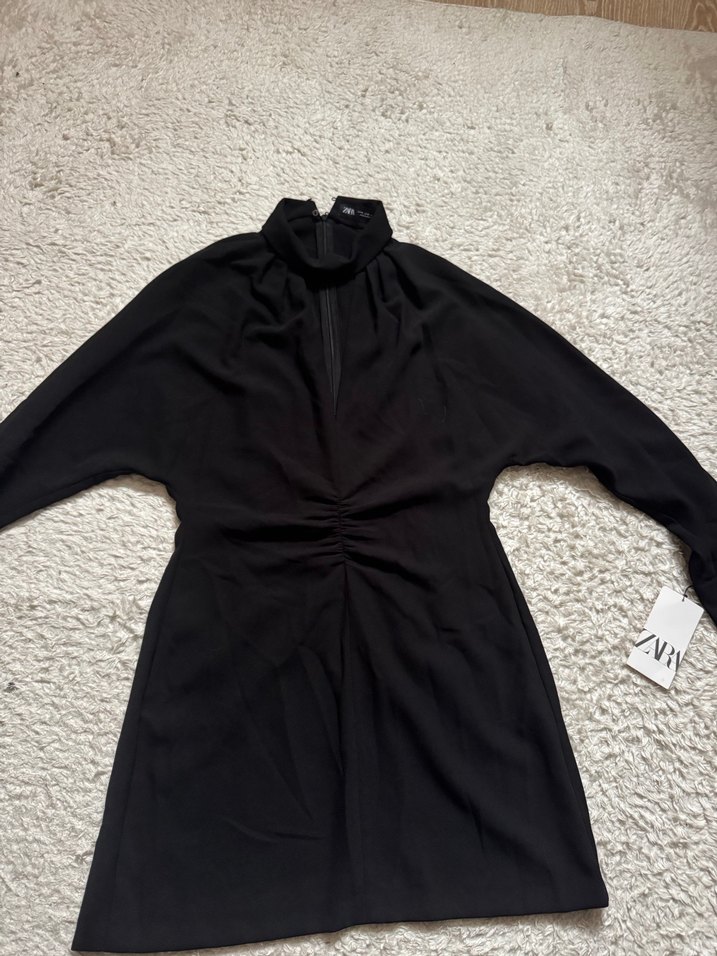 Bu siyah, uzun kollu ve drapeli kadın elbise, yüksek yakası ve vücuda oturan kesimiyle şık bir görünüm sunar. Gotik tarzda modaya uygun bir tercih.