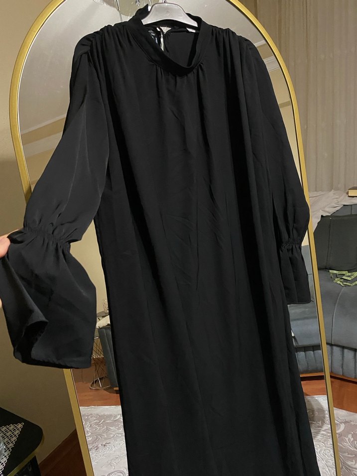 Siyah renkte, yüksek yakalı ve drapeli tasarıma sahip uzun kollu, bol kesim kadın elbise dubai İpekgi kumaştan üretilmiş, 2/3 kere giydim ısıktan dolayı soluk cıkmıs rengi tam siyah eymahcadan aldım standart beden seyyar kemeri var