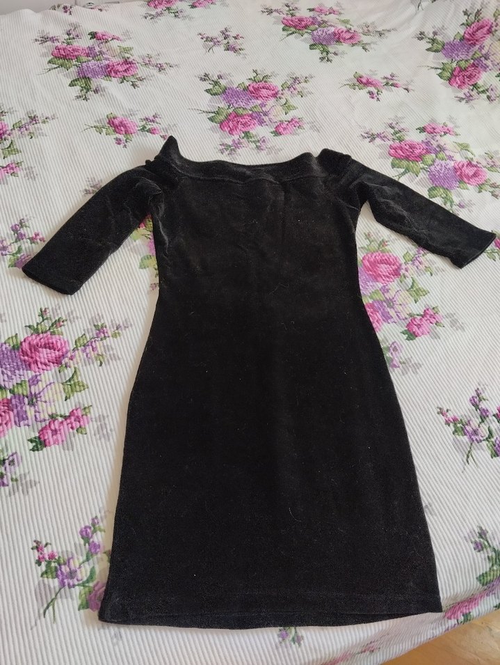 Siyah renkli, uzun kollu, drapeli ve tek renk midi elbise. Tekne yaka ve vücuda oturan kesimiyle romantik akşamlar için uygun.