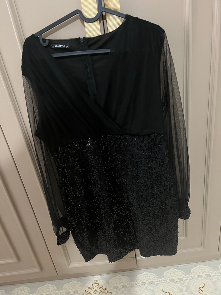 Bu siyah, drapeli ve v yaka uzun kollu midi elbise, gotik tarzıyla şık bir parti görünümü sunar. ✨