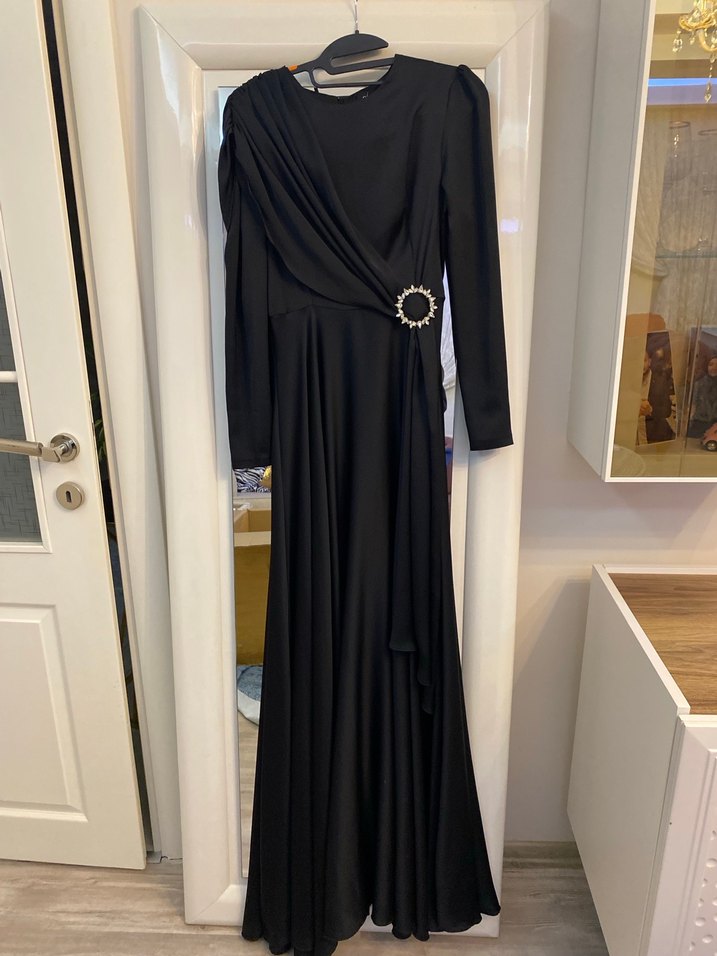 Siyah Drapeli Uzun Kollu Uzun Abiye Elbise