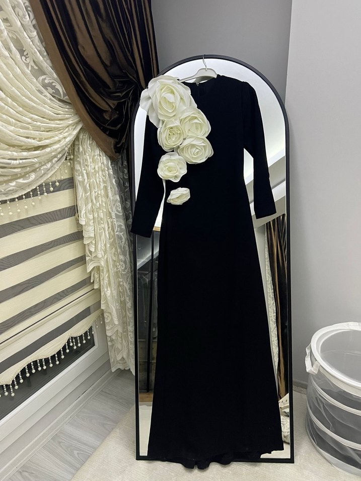 Siyah uzun elbise, drapeli tasarımı, uzun kolları ve tekne yaka ile dikkat çeker. Sentetik kumaştan, çiçek desenli ve regular fit modeldir, özel davetlere uygundur.