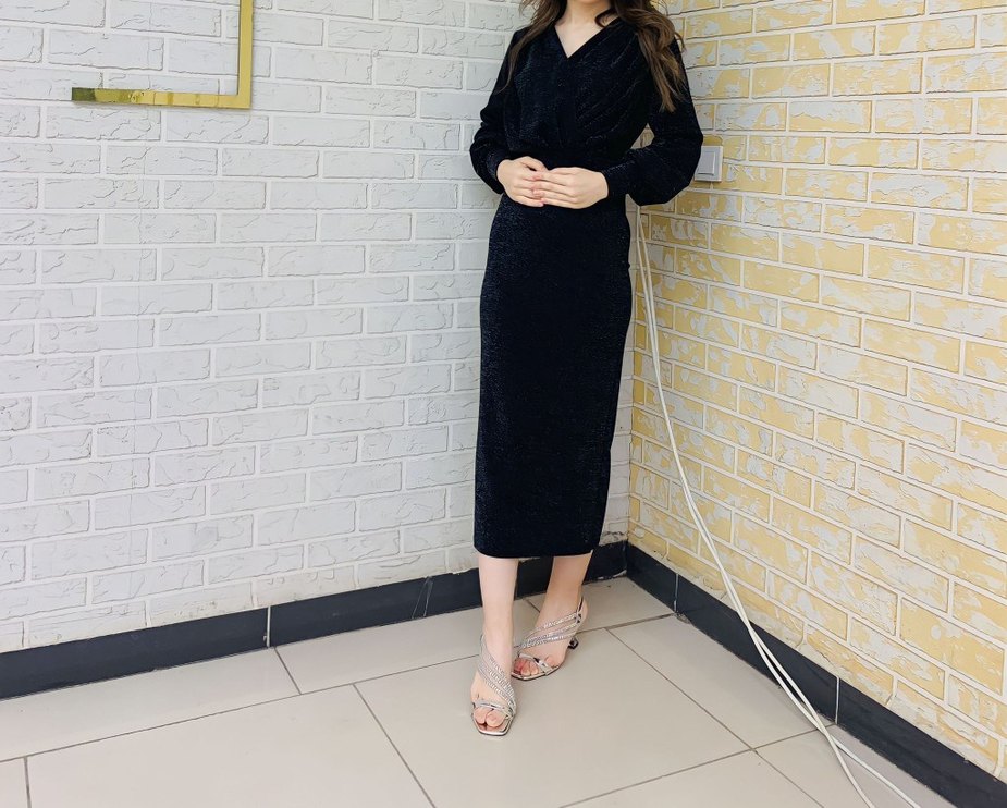 Drapeli tasarıma sahip, uzun kollu ve V yakalı siyah dar kesim uzun elbise, yumuşak sentetik kumaştan üretilmiştir. Ofis için klasik ve şık bir görünüm sunar.