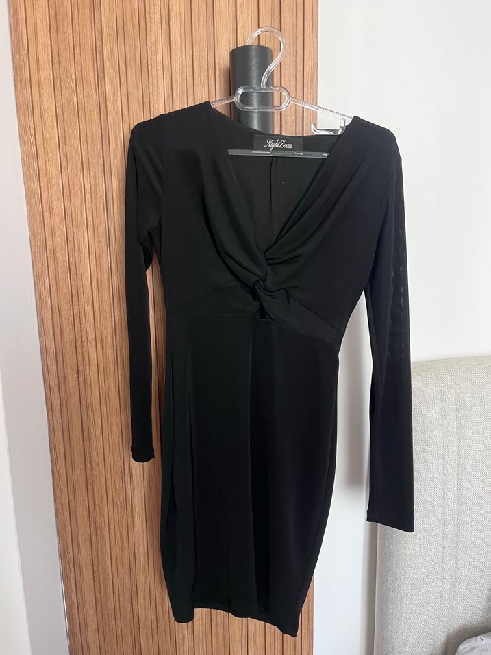 Bu siyah, uzun kollu, v yaka, drapeli elbise, klasik ve minimalist gotik tarzda, ofis için uygun şık ve vücuda oturan bir modeldir.