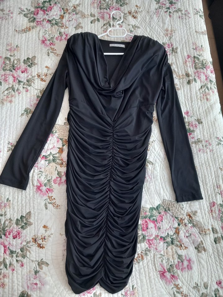 Siyah, uzun kollu ve drapeli V yaka, vücuda oturan uzun elbise. Baskılı ve büzgülü tasarımıyla gotik tarzda parti için uygun.