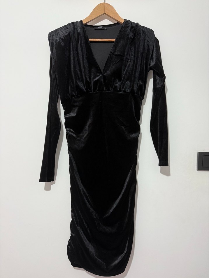 Siyah, uzun kollu ve drapeli yapısıyla bu dar kesim elbise, V yakalı ve uzun boydur. Gotik tarzıyla romantik akşamlar için uygundur.