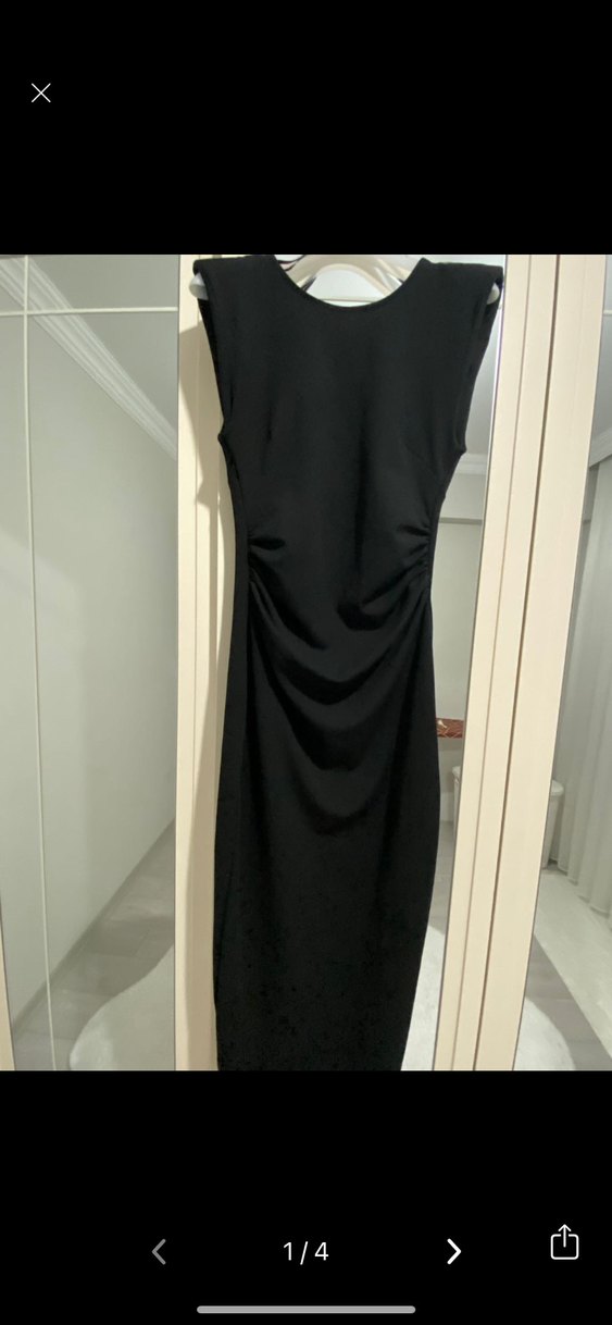 Siyah, kolsuz ve uzun boy elbise, drapeli detaylı ve yüksek yakalıdır. Esnek kumaştır