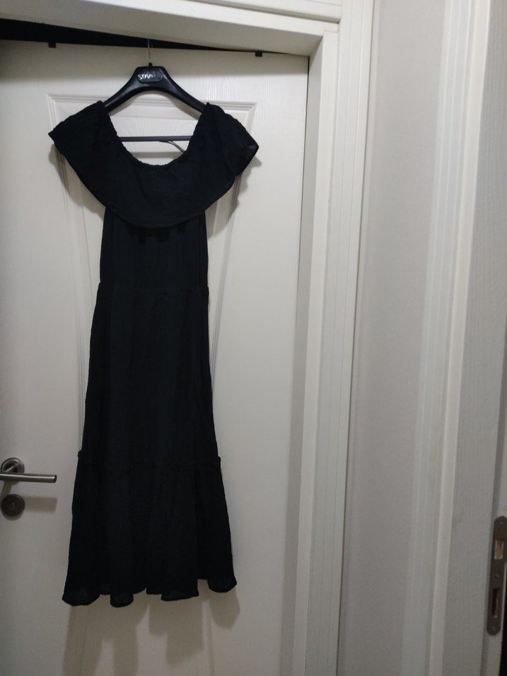 Siyah uzun keten elbise, drapeli kayık yaka ve kolsuz tasarıma sahip. Gevşek kesimiyle minimalist ve gotik tarzlara uygun, günlük kullanım için ideal.