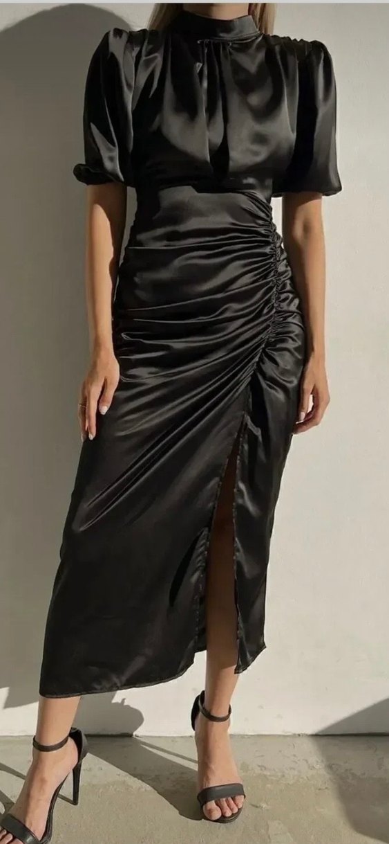 Saten kumaştan, V yakalı ve askılı kollu, drapeli ve vücuda oturan siyah uzun elbisedir. Parlak dokusuyla romantik akşamlar için uygundur.