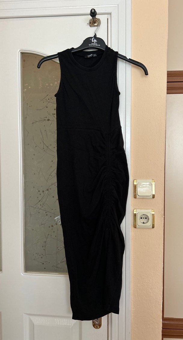 Siyah, drapeli ve yüksek yakalı, kolsuz uzun elbise. Düz, sentetik kumaştan yapılmış, gotik tarzda romantik akşamlar için ideal.