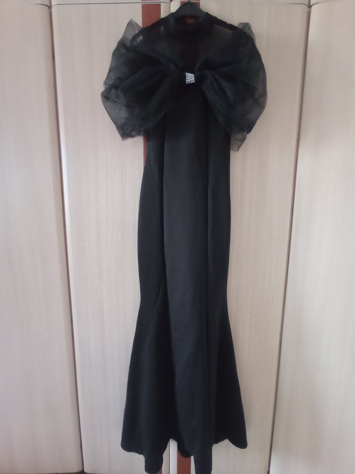 Siyah, straplez yakalı ve askılı kolları olan, drapeli detaylarla avant-garde tarzı yansıtan, uzun ve vücuda oturan abiye elbise.